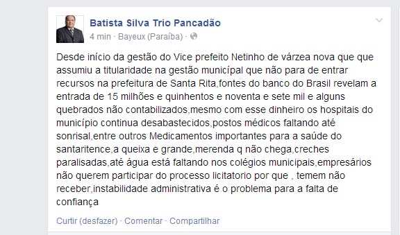 Apresentador do Programa Fogo Cruzado da Radio Sanhauá 1280Am das 09:00hs às 10:00hs colocou hoje em sua pagina pessoal de Facebook toda sua indignação quanto ao a Péssima administração feita pelo Vice Prefeito Netinho que assumiu Temporariamente a Prefeitura depois de um Golpe arquitetado pelo mesmo.