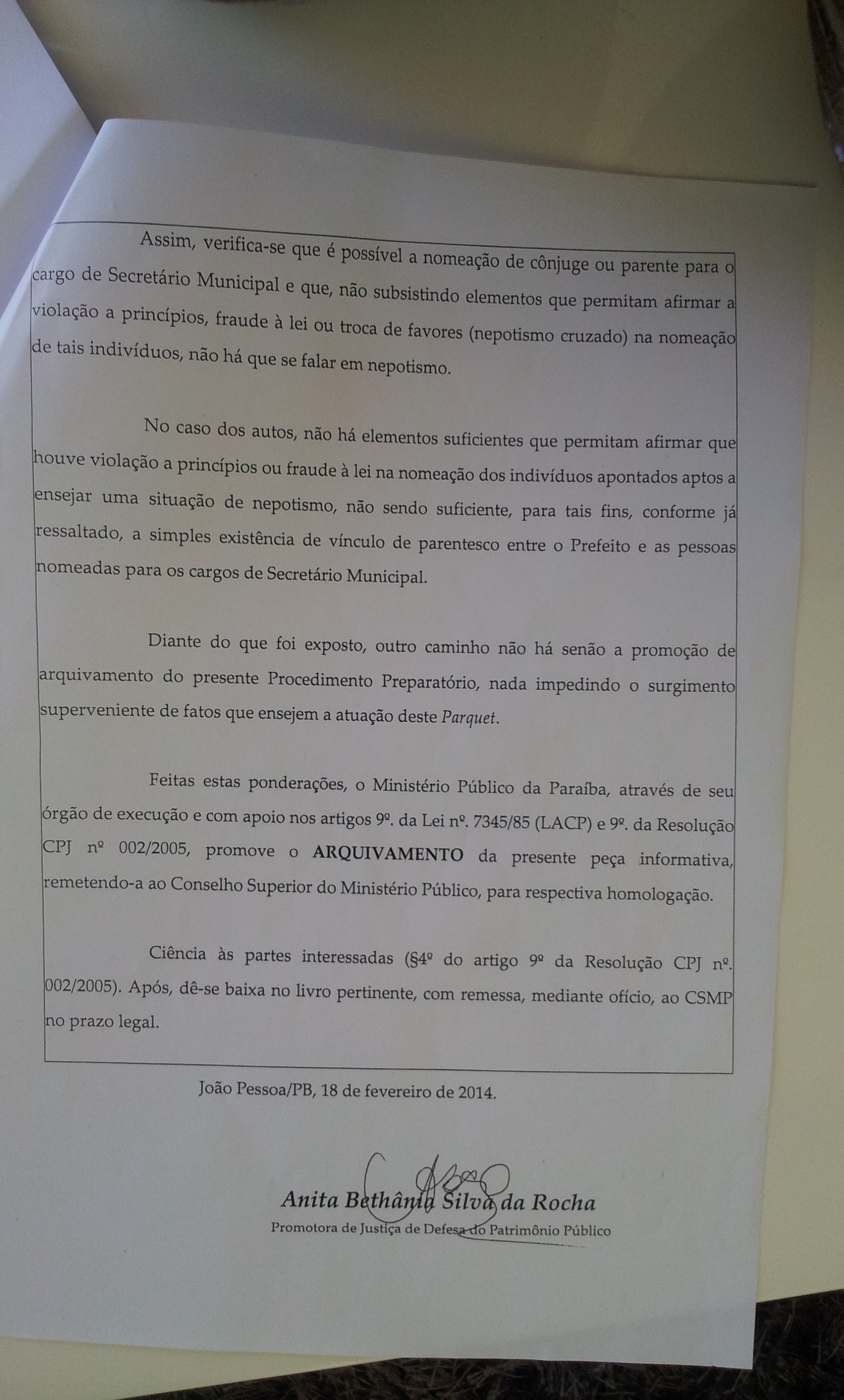 O processo de nepotismo apresentado hoje pela Câmara de Santa Rita fere a Democracia e a Constituição Federal, O Ministério Publico de Santa Rita já tinha Arquivado o processo de nepotismo desde do dia 14 de março de 2014 oficio Nº119/2014 – PDSIISR.