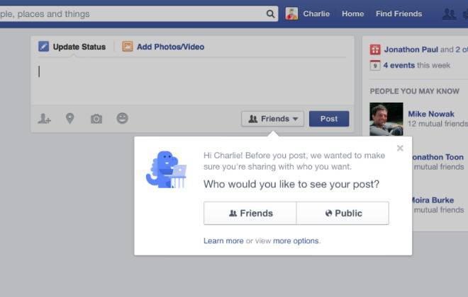 Como o Facebook era novo para essas pessoas, elas nem sempre entendiam o que significava compartilhar só com alguns ou com todos, o que gerava confusão. Os novatos ainda receberão um lembrete para escolher a audiência adequada assim que resolverem postar alguma coisa.