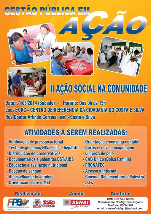 A turma do terceiro período do curso de Gestão Pública, da Faculdade Internacional da Paraíba (FPB), em parceria com a Prefeitura Municipal de João Pessoa (PMJP), oferecerá serviços públicos à população através da “II Ação Social na Comunidade”, no dia 31 de maio, das 9h às 15h, no Centro de Referência da Cidadania do Costa e Silva – CRC. Além do apoio da PMJP, a Ação Social, contará com o Serviço Nacional de Aprendizagem Industrial (SENAI).