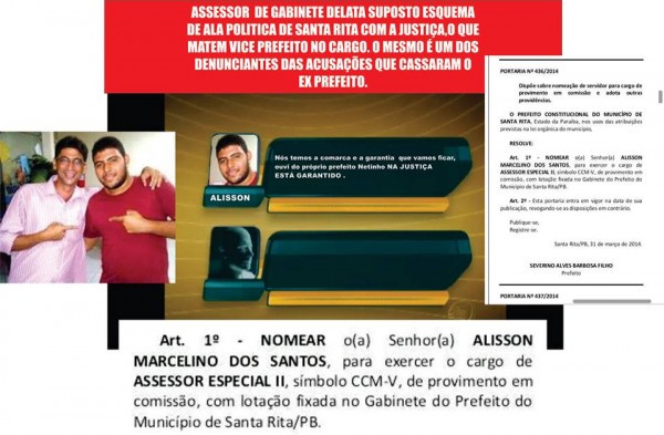 Assessor de Gabinete delata suposto esquema de ala Politica de Santa Rita com a Justiça, Que vem mantendo o Vice Prefeito Netinho de Várzea Nova no cargo. O Assessor Álisson Marcelino dos Santos também é um dos denunciantes das acusações que Cassaram o Ex-Prefeito Reginaldo Pereira em Santa Rita.