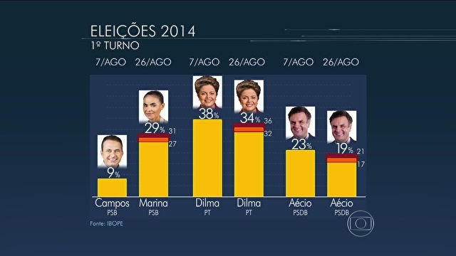 No levantamento anterior do instituto, divulgado no último dia 7, o candidato do partido ainda era Eduardo Campos, que morreu em acidente aéreo no último 13. Naquela pesquisa, Dilma tinha 38%, Aécio, 23%, e Campos, 9%. Entre uma pesquisa e outra, a taxa de indecisos passou de 11% para 8%, e a de quem pretende votar em branco ou nulo, de 13% para 7%.