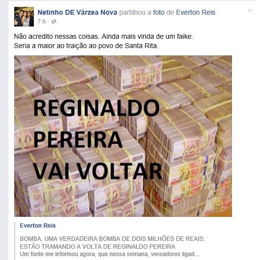 O que mais chamou atenção foi o Próprio Vice Netinho compartilhar eu sem Facebook. “Não acredito nessas coisas. Ainda mais vinda de um faike. Seria a maior traição ao povo de Santa Rita” disse Netinho.