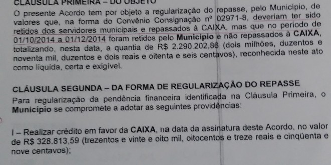 Essa quantia foi retida dos servidores municipais no período de 01/10/2014 a 01/12/2014, mas a Caixa Econômica nunca recebeu esse dinheiro. Em reunião com o gerente geral da CEF, Marcelo Queiróz, o prefeito Reginaldo dividiu esse débito em seis vezes, com parcelas de R$ 326.898.