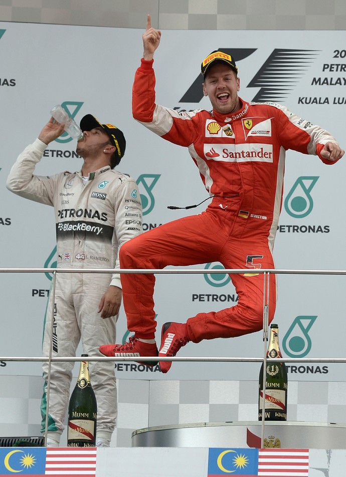 Nunca subestime um tetracampeão mundial. Nem a mais vitoriosa equipe da história da Fórmula 1. Sebastian Vettel está de volta, a Ferrari também. No GP da Malásia deste domingo, o alemão desbancou Lewis Hamilton, da Mercedes, e chegou ao seu primeiro triunfo pela escuderia de Maranello com apenas duas corridas em sua nova casa. A equipe não vencia desde maio de 2013, e o piloto, desde novembro desse mesmo ano. Pelo rádio, o chefe Maurizio Arrivabene celebrou: “O número 1 está de volta. A Ferrari está de volta!”. Vettel respondeu em italiano: “Grazie mille! (Muito obrigado)”. No pódio, o sorriso largo era a prova da realização de um sonho de infância: vencer com o macacão vermelho. Para terminar, após o hino da Alemanha, Seb regeu o hino da Itália, repetindo o gesto de seu maior ídolo, Michael Schumacher. Definitivamente, a mistura piloto alemão e equipe Ferrari dá liga.