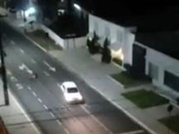 Imagens – feitas de um apartamento – mostram quando o travesti caminha pela calçada e passa um carro em alta velocidade, na contramão