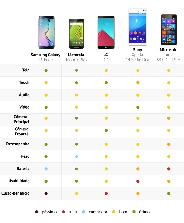 O UOL Tecnologia avaliou, comparativamente, telefones que têm como diferencial a qualidade das selfies. De acordo com fabricantes, os modelos indicados para ótimos autorretratos são Samsung Galaxy S6 Edge, Motorola Moto X Play, LG G4, Sony Xperia C4 Selfie Dual e Microsoft Lumia 535 Dual SIM. Todos eles foram avaliados por 10 dias.