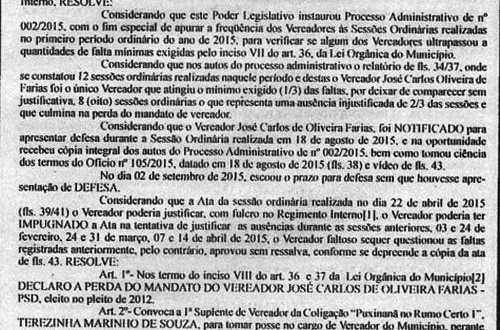 A mesa diretora do legislativo puxinanaense havia aberto um processo administrativo para apurar a frequência dos vereadores e descobriu que Carlinhos tinha faltado mais sessões do que prevê o regimento interno da Casa.