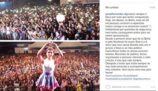 Paula Fernandes virou piada em sites e em redes sociais por ter um show cancelado em Vitória da Conquista, na Bahia, pois conseguiu vender apenas 120 ingressos dos três mil que estavam disponíveis. Para disfarçar e tentar tirar essa péssima imagem, a cantora teve a coragem de postar em sua rede social um texto e fotos de um show lotado que ela fez no último sábado (19) em Abaíra, na Bahia, mas esqueceu de dizer que a entrada era gratuita e que o evento todo foi bancado pela prefeitura da cidade.