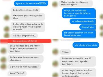 “Hoje à noite você terá a chance de me dar a maior prova de amor do mundo, que é sua própria filha”, diz a mensagem. “Ela é virgem, ela que tem que escolher com quem vai perder a virgindade, não eu”, argumenta a mulher. “Se você deixasse, dava para fazer tudo e ela nem acordaria. Ninguém nunca saberia, só eu e você. Realiza esse sonho meu, eu ia acabar de vez com essa obsessão”, teria retrucado o PM.