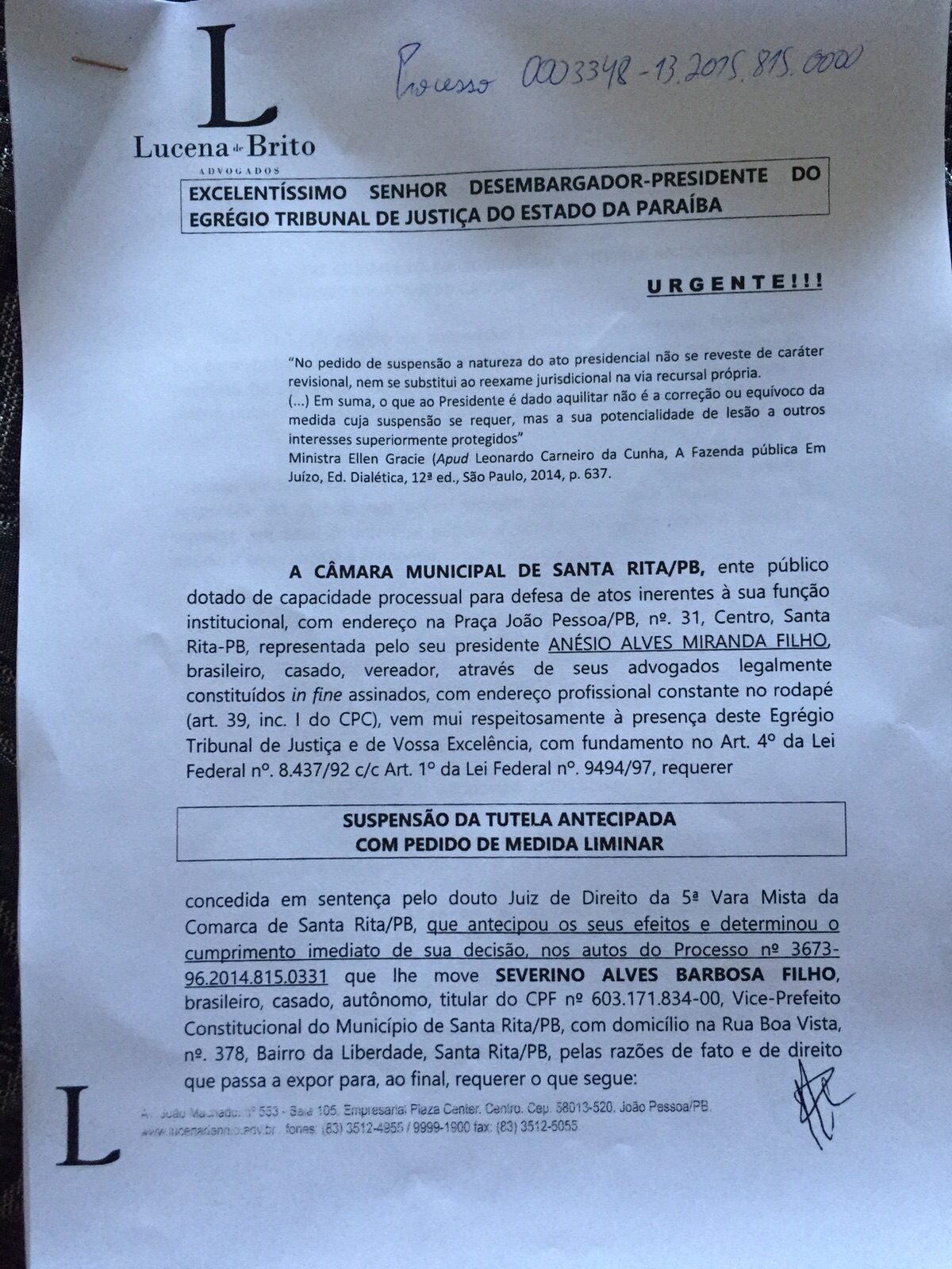 O mesmo esclareceu que a Câmara entrou com um incidente, distribuído às 13h23min da última sexta-feira, dentro do expediente forense, para encaminhar um pedido que suspende a tutela antecipada que colocou Netinho no cargo de prefeito. Este pedido tem o intuito não de defender um ou outro pretendente ao cargo de Prefeito, mas sim de acabar com as “guerras de liminares” que geram uma absurda alternância no cargo de Prefeito do Município, prejudicando a população de Santa Rita/PB com a descontinuidade administrativa.
