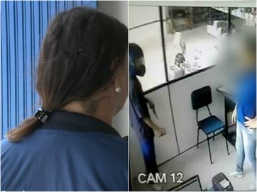 Empresária teve que ser segurada por um funcionário da empresa quando tentou ‘atacar’ os criminosos que fugiam com os equipamentos roubados