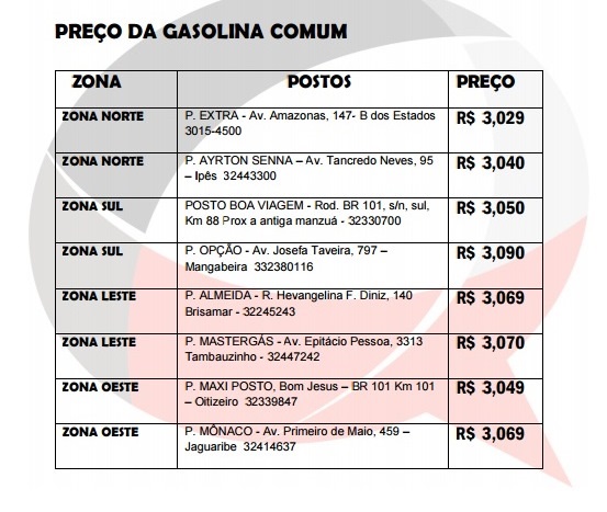 O óleo diesel aumentou de preço em 49 postos, reduziu em 01 e 04 mantiveram, com o menor preço, R$ 2,679, no Posto Novais (Bairro do Novais) e o maior, R$ 2959, no Posto Cajueiro (Geisel). Os 11 postos que comercializam o Gás Natural Veicular (GNV) mantiveram os preços, com o menor sendo vendido a R$ 2,259 e o maior a R$ 2,300.