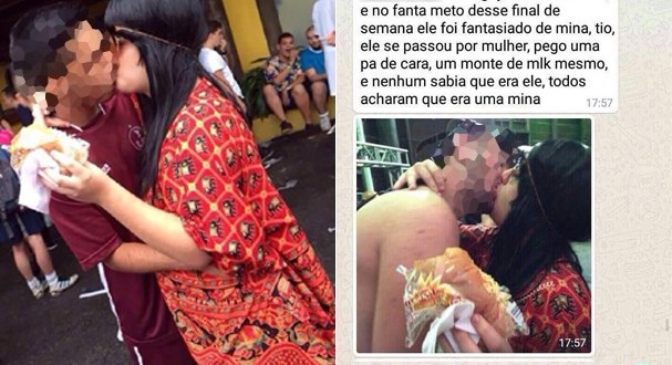 Uma história está se espalhando pelo Facebook: um rapaz foi a uma festa na grande São Paulo, vestido de mulher, e beijou vááários homens. O boato foi contado em uma série de imagens de conversas por WhatsApp. Ele teria ficado com cerca de 175 caras (aparentemente heterossexuais) sem que eles soubessem que ele fosse, na realidade, homem. Em uma das mensagens conta que tem fotos de 60, das 175 ficadas.