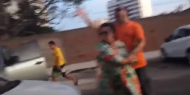 Ao manobrar para fugir com o carro, o ladrão colide em um carro branco e atinge uma jovem, que grita e bate na caminhonete. A seguir, os proprietários da caminhonete tentam impedir que o ladrão fuja, mas ele avança e os atropela. Ele chega a passar por cima da senhora, dona do carro roubado.