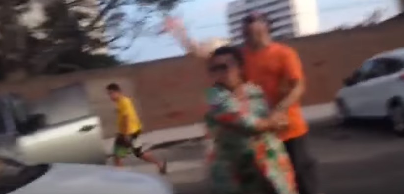 Ao manobrar para fugir com o carro, o ladrão colide em um carro branco e atinge uma jovem, que grita e bate na caminhonete. A seguir, os proprietários da caminhonete tentam impedir que o ladrão fuja, mas ele avança e os atropela. Ele chega a passar por cima da senhora, dona do carro roubado.