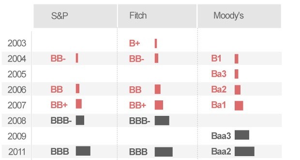A nota da dívida de longo prazo do país em moeda estrangeira foi reduzida de BBB- para BB+, o primeiro degrau do que é considerado grau especulativo. A agência também colocou a nota do país em perspectiva negativa, indicando que ela pode voltar a ser rebaixada.