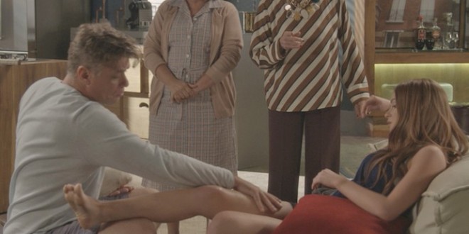 Só que a pequena rebelde finge fotografar a cena e acaba empurrando os dois, fazendo Arthur e Eliza caírem no chão embolados. Constrangido, o bon vivant oferece uma massagem, e a ruiva, cheia de dores, não nega, mas dá recado: “Tá melhorando mesmo. (…) Não vai tirando casquinha não, seu tarado, que eu não sou das suas”.