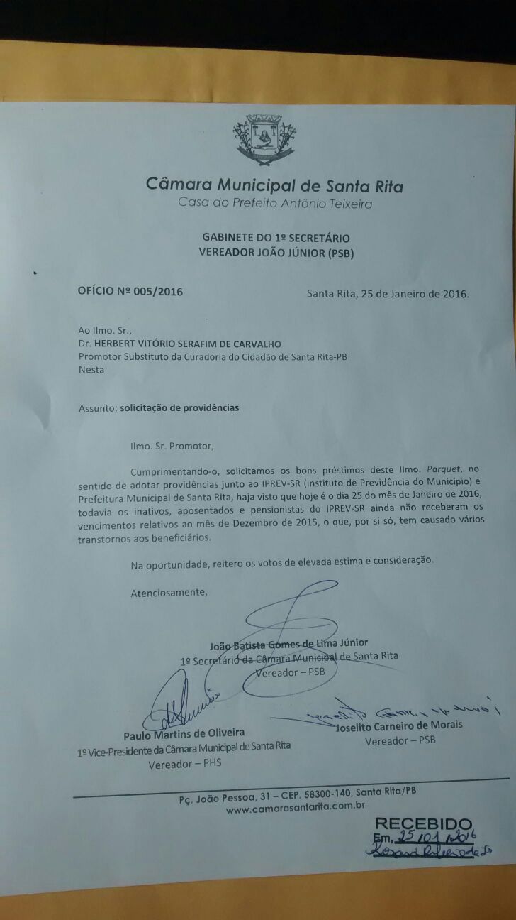 A Câmara Municipal de Santa Rita entrou no dia ontem 26 de janeiro, com pedido junto ao Ministério Público de Santa Rita e ao Tribunal de Contas que se tome providências urgentes quanto ao Pagamento do IPREV/SR – Instituto de Previdência do Municipio de Santa Rita.