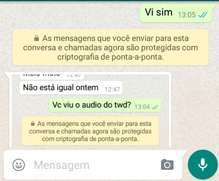 A novidade vale para todas as versões do aplicativo, em todas as plataformas. Ou seja: não importa se você usa Android, iOS, Windows Phone, BlackBerry ou até mesmo um celular antigo da Nokia. O aplicativo até mesmo começou a avisar sobre a proteção das conversas, como mostra a captura abaixo.