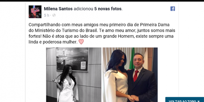 A assessoria de imprensa do Ministério do Turismo não quis informar há quanto tempo Milena e o titular da pasta são casados. Na postagem desta segunda-feira, a modelo se mostra apaixonada: “Te amo meu amor, juntos somos mais fortes!”. Este ano, em 13 de março, ela escreveu um texto se manifestando contrário ao impeachment da presidente Dilma Rousseff.