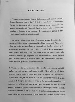 Em nota divulgada à imprensa, Maranhão diz que a petição da AGU ainda não havia sido analisada pela Casa e que, ao tomar conhecimento dela, resolveu acolher. Na decisão, ele argumenta “ocorreram vícios que tornaram nula de pleno direito a sessão em questão”.
