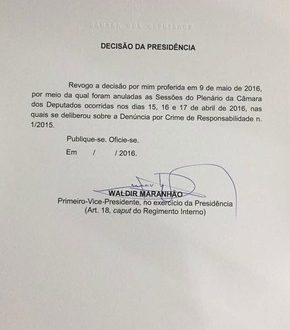 “Revogo a decisão por mim proferida em 9 de maio de 2016 por meio da qual foram anuladas as sessões do plenário da Câmara dos Deputados ocorridas dias 15, 16 e 17 de abril de 2016, nas quais se deliberou sobre a Denúncia por Crime de Responsabilidade n.1/2015”, diz o texto do ofício assinado por Waldir Maranhão.