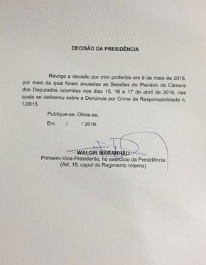 “Revogo a decisão por mim proferida em 9 de maio de 2016 por meio da qual foram anuladas as sessões do plenário da Câmara dos Deputados ocorridas dias 15, 16 e 17 de abril de 2016, nas quais se deliberou sobre a Denúncia por Crime de Responsabilidade n.1/2015”, diz o texto do ofício assinado por Waldir Maranhão.
