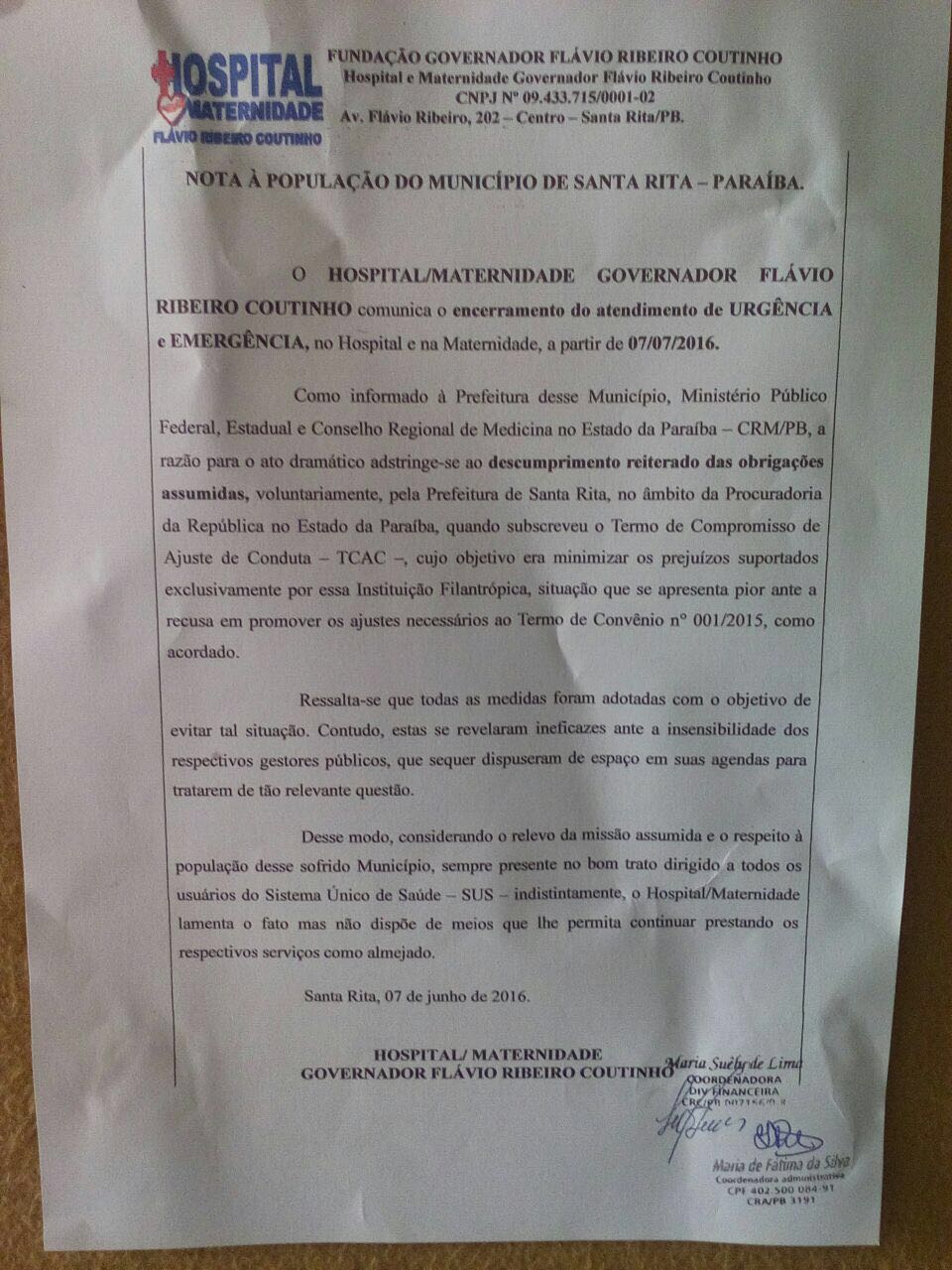 Comunicando o encerramento para atendimento de Emergência e Urgência devido a falta de pagamento da Prefeitura Municipal de Santa Rita.