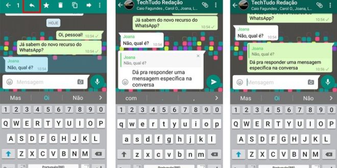 O novo recurso possibilita responder diretamente uma mensagem enviada dentro de uma conversa, por meio de uma citação no momento da resposta. Depois que for enviada, aparecerá o nome do remetente e o texto da mensagem respondida. Assim, os usuários poderão saber para qual mensagem a resposta foi direcionada.
