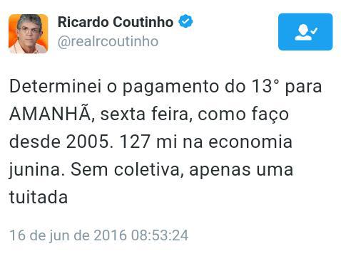 O governador Ricardo Coutinho (PSB) anunciou, em seu perfil no Twitter, na manhã desta quinta-feira (16), o pagamento da primeira parcela do 13° salário ao funcionalismo público estadual. De acordo com o socialista, serão injetados R$ 127 milhões na economia paraibana, durante festejos juninos.