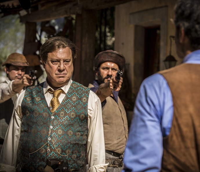 Junto com seus capangas, Afrânio já chega na fazenda Piatã atirando para cima, e a família fica em pânico com a gravidade da situação. Sem medo, Santo enfrenta o rival, mas o coronel avisa que quer falar com seu neto, fazendo outra ameaça ao fazendeiro. Neste momento, o agrônomo chega e confronta o avô: “Se for pra dar mais algum tiro, vai ter que ser em mim primeiro”.