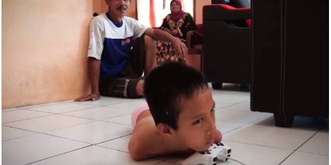 Aos 11 anos, o garoto da Indonésia conta com a ajuda dos pais e amigos para estudar e realizar outras atividades. Para jogar videogame, no entanto, ele só precisa posicionar o controle entre o ombro e o queixo. Parece difícil, mas Tivo já dominou a prática, uma vez que joga todos os dias antes de ir para a escola.