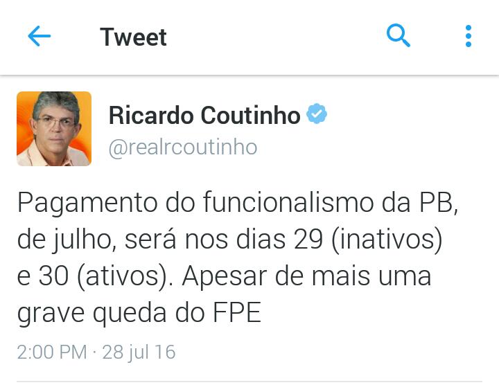“Pagamentos do funcionalisno da PB de julho, será nos dias 29 (inativos) e 30 (ativos), apesar da queda do FPE”, postou RC.