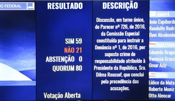 Cinquenta e nove parlamentares votaram pela aprovação da denúncia, enquanto apenas 21 defenderam a presidente afastada