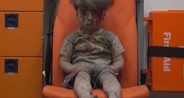 A foto que mostra Omran Daqneesh, de shorts, sujo de sangue e completamente coberto de poeira causou comoção nas redes sociais. Em estado de choque, o menino aguarda atendimento em uma ambulância.