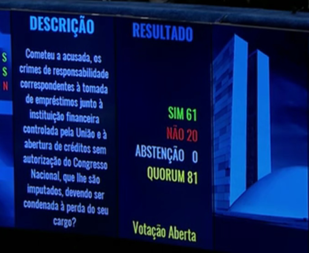 A fase final de julgamento começou na última quinta-feira (25) e se arrastou até hoje com a manifestação da própria representada, além da fala de senadores, testemunhas e dos advogados das duas partes. Nesse último dia, o ministro Ricardo Lewandowski leu um relatório resumido elencando provas e os principais argumentos apresentados ao longo do processo pela acusação e defesa. Quatro senadores escolhidos por cada um dos lados – Vanessa Grazziotin (PCdoB-AM) e Randolfe Rodrigues (Rede-AP), pela defesa, e Ronaldo Caiado (DEM-GO) e Ana Amélia (PP-RS), pela acusação – encaminharam a votação que ocorreu de forma nominal, em painel eletrônico.