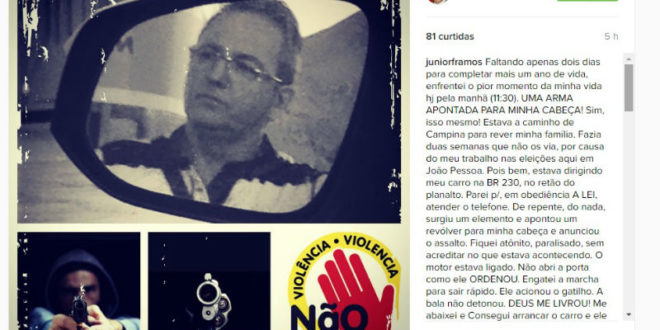 “Faltando apenas dois dias para completar mais um ano de vida, enfrentei o pior momento da minha vida hj pela manhã (11:30). UMA ARMA APONTADA PARA MINHA CABEÇA! Sim, isso mesmo! Estava a caminho de Campina para rever minha família. Fazia duas semanas que não os via, por causa do meu trabalho nas eleições aqui em João Pessoa. Pois bem, estava dirigindo meu carro na BR 230, no retão do planalto. Parei p/, em obediência A LEI, atender o telefone. De repente, do nada, surgiu um elemento e apontou um revólver para minha cabeça e anunciou o assalto. Fiquei atônito, paralisado, sem acreditar no que estava acontecendo. O motor estava ligado. Não abri a porta como ele ORDENOU. Engatei a marcha para sair rápido. Ele acionou o gatilho. A bala não detonou. DEUS ME LIVROU! Me abaixei e Consegui arrancar o carro e ele atirou novamente. Dessa vez a bala detonou, mas, graças ao meu Deus eu já estava fora do alcance. Compartilho esse momento tão delicado que vivi, primeiro, para agradecer a DEUS pelo livramento, hj eu poderia ser mais UM NÚMERO NAS ESTATÍSTICAS DA VIOLÊNCIA, uma imagem no “retrovisor” como na foto acima. 2º para ALERTAR a todos. Não parem o seu carro na BR, pois ao relatar o fato na polícia rodoviária e fazer o boletim de ocorrência, fui informado pelo PRF que esse tipo de abordagem está se tornando comum nas estradas. Não vou me valer disso para culpar as autoridades de segurança, governo, policia ou quem quer que seja. Reputo isso a maldade do ser humano que não tem respeito pela vida do próximo. #naoaviolencia #violencianao #obrigadomeudeus #obrigadojesus”