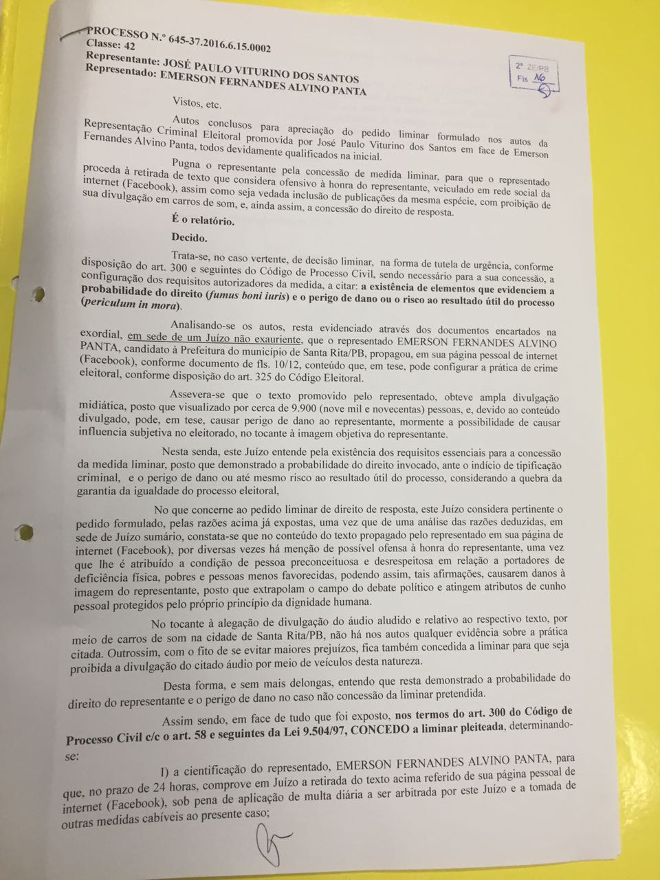 A juíza entendeu que Zé Paulo em nenhum momento faltou com respeito aos deficientes e ordenou a retirada da publicação e o candidato Zé Paulo terá direito de resposta na página de Facebook de Emerson Panta.
