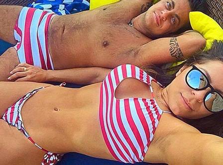 “Um casal combinando! Achei meigo! gostaram?”, destacou a modelo na legenda da imagem postada na rede social. Na imagem, a estampa da roupa de banho de Thammy é a mesma do biquíni da namorada.