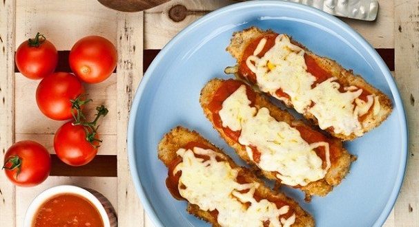 Depois de fritos, coloque os filés em um refratário, regue o molho de tomate e polvilhe a mussarela. Leve ao forno pré-aquecido a 200°C por 10 minutos ou até que derreta. Sirva com arroz branco e batata palha.