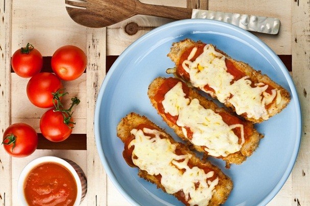 Depois de fritos, coloque os filés em um refratário, regue o molho de tomate e polvilhe a mussarela. Leve ao forno pré-aquecido a 200°C por 10 minutos ou até que derreta. Sirva com arroz branco e batata palha.