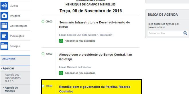 O Ministro da Fazenda, Henrique Meirelles, vai receber o governador Ricardo Coutinho nesta terça-feira (08). O encontro está registrado na agenda oficial do ministro às 15 h.