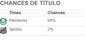 Se a situação do Palmeiras já era confortável antes da 36ª rodada do Brasileirão, os resultados de domingo deixaram o líder com uma das mãos e quase todos os dedos da outra na taça. A vitória sobre o Botafogo e o tropeços de Santos e Flamengo fizeram as chances de título do Verdão pularem para 98%. Os 2% restantes estão com o Peixe, que precisa vencer seus dois últimos jogos e torcer para o rival não pontuar mais. Os cálculos são do site Infobola, do matemático Tristão Garcia. Missão impossível para os santistas? Deixe sua opinião nos comentários.