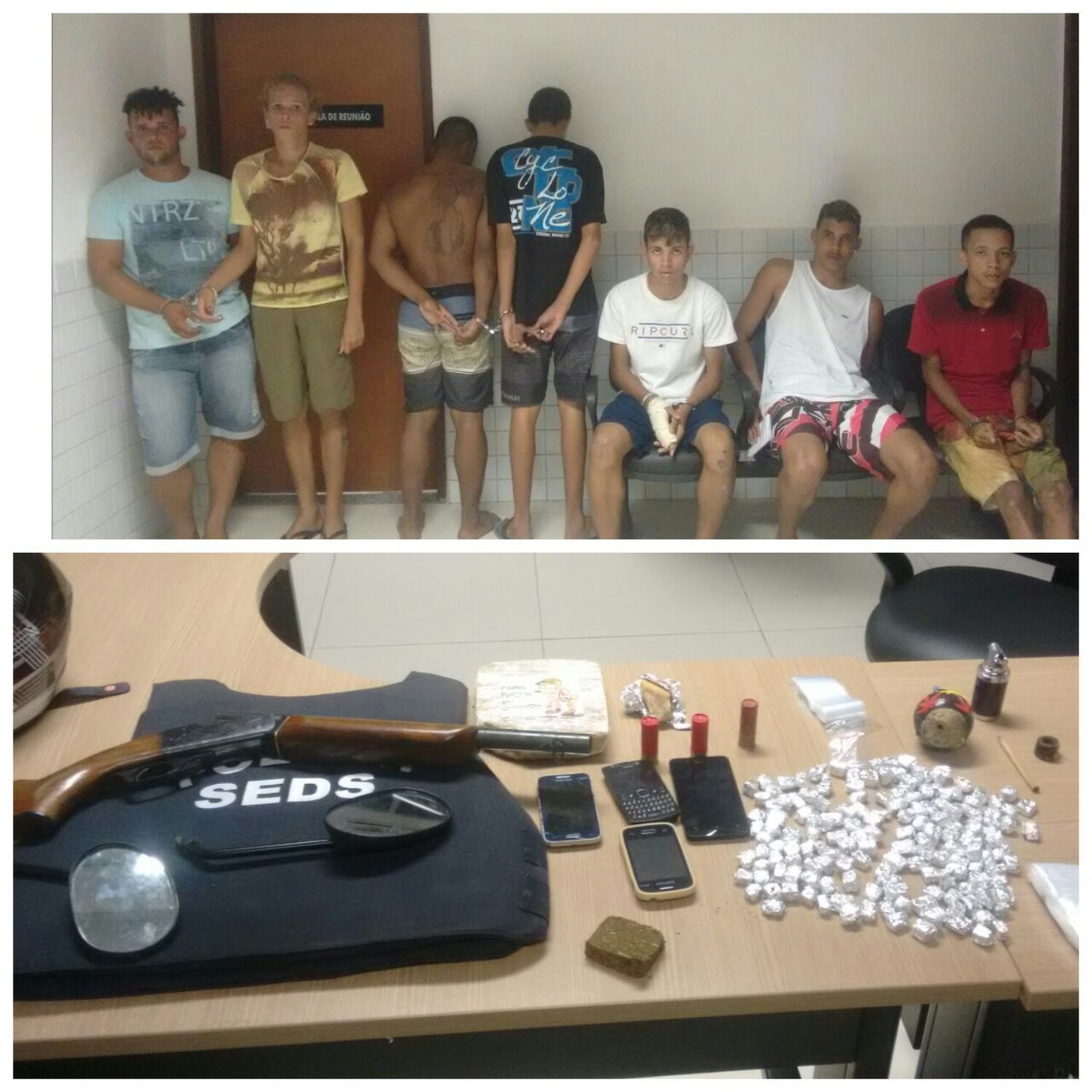 Durante a ação, foram apreendidos dois menores e cinco maiores, além de uma espingarda calibre 12, várias trouxinhas de maconha, Crack, moto com restrição e roubo e peças de motocicletas roubadas.