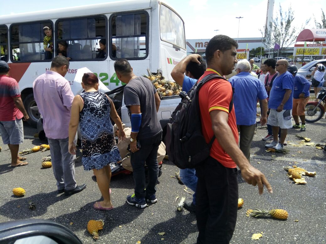 Dois homens se feriram depois de ficarem presos nas ferragens após um acidente envolvendo um ônibus e um carro que carregava abacaxis, às 12h20 desta quarta-feira (30), em um trecho da BR-230, no bairro do Esplanada, na Zona Sul de João Pessoa.