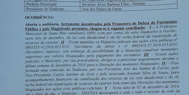 Em audiência no fórum de Santa Rita, o Juiz Dr. Wladimir Alcibiades Marinho Falcão Cunha e a Promotoria do Patrimônio Público através da Dra. Anita, decidiram em reunião com sindicato dos servidores de Santa Rita pela reintegração de posse do prédio da prefeitura de Santa Rita.