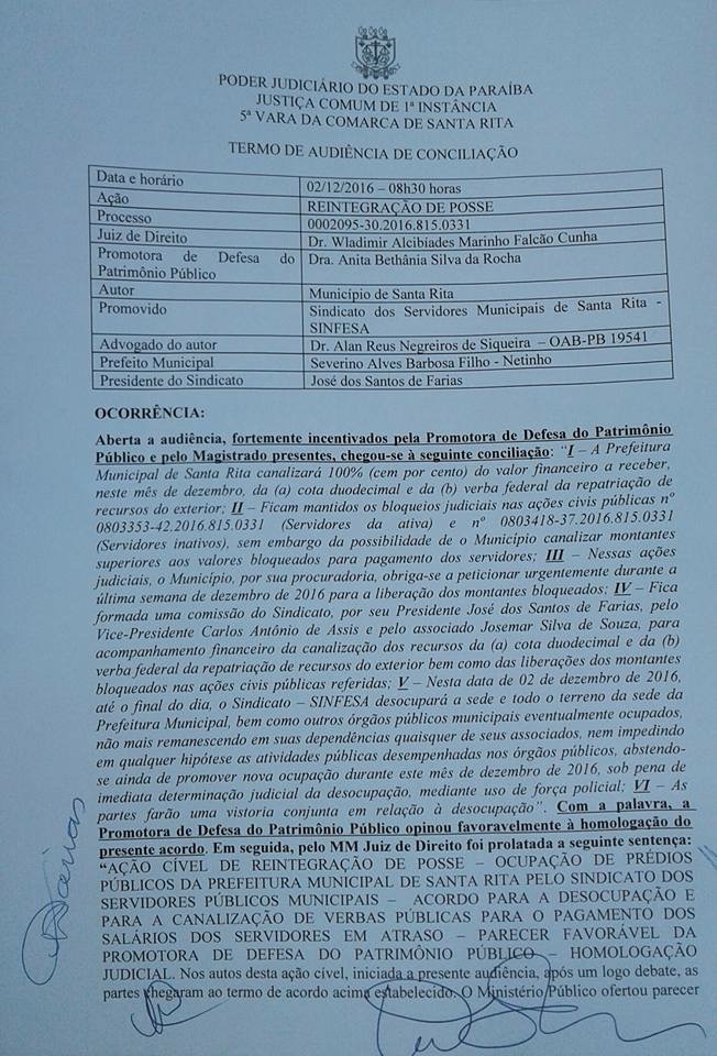 Em audiência no fórum de Santa Rita, o Juiz Dr. Wladimir Alcibiades Marinho Falcão Cunha e a Promotoria do Patrimônio Público através da Dra. Anita, decidiram em reunião com sindicato dos servidores de Santa Rita pela reintegração de posse do prédio da prefeitura de Santa Rita.