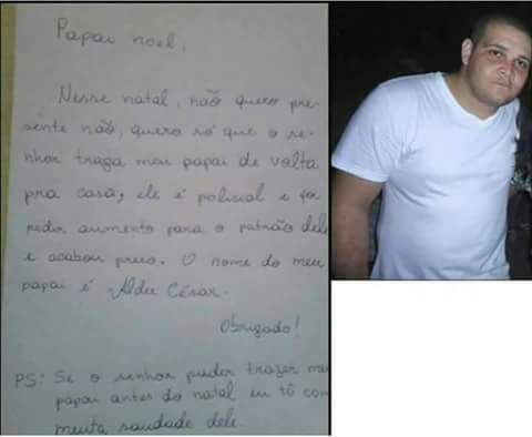 Uma criança escreve para Papai Noel, pedindo que o Pai que é Policial Militar seja solto antes do natal. Ela não quer um brinquedo de presente natalino, mas sim o pai que, junto a mãe, a pessoa mais especial de sua vida.