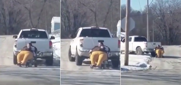 Nas imagens, a “carona” é vista sentada em uma cadeira de rodas. Elas foram feitas por um motorista que vinha atrás.